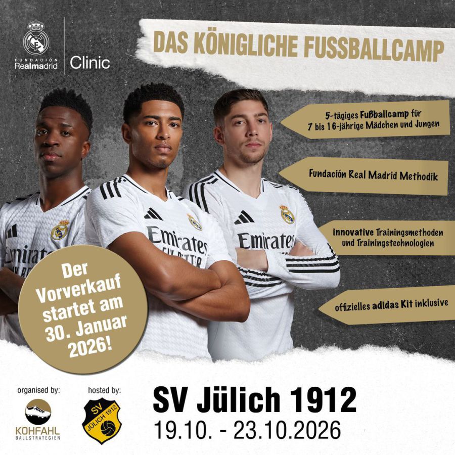 Vom 19. bis 23. Oktober 2026 wird der SV Jülich 1912 Gastgeber eines ganz besonderen sportlichen Highlights: dem königlichen Fußballcamp der Fundación Real Madrid Clinic. Das fünftägige Trainingscamp